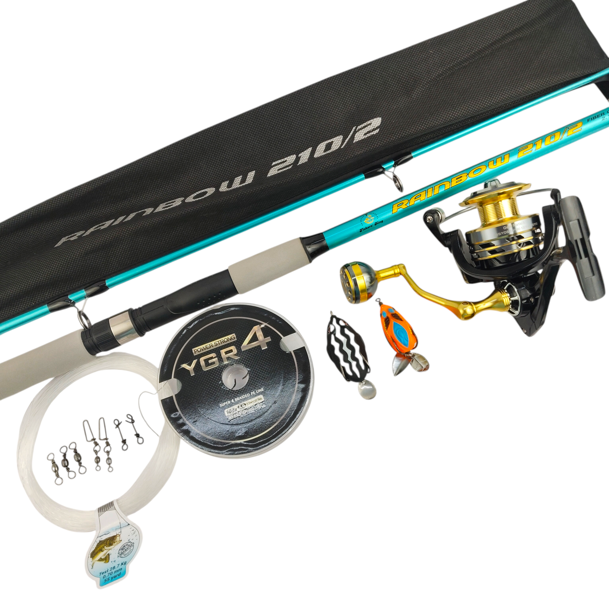1.Fishers King Rainbow 7ft Fiber Glass Spinning Fishing Rod is a versatile and portable fishing rod designed for both saltwater and freshwater fishing. Crafted with high-quality carbon fiber, this rod offers exceptional strength, sensitivity, and durability.